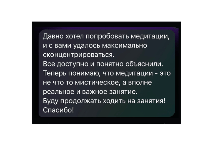 На групповых практиках мы разбираем определенную тему, выполняем дыхательные практики и практику медитации. В конце вы сможете задать интересующий вас вопрос, и мы его обязательно разберем.